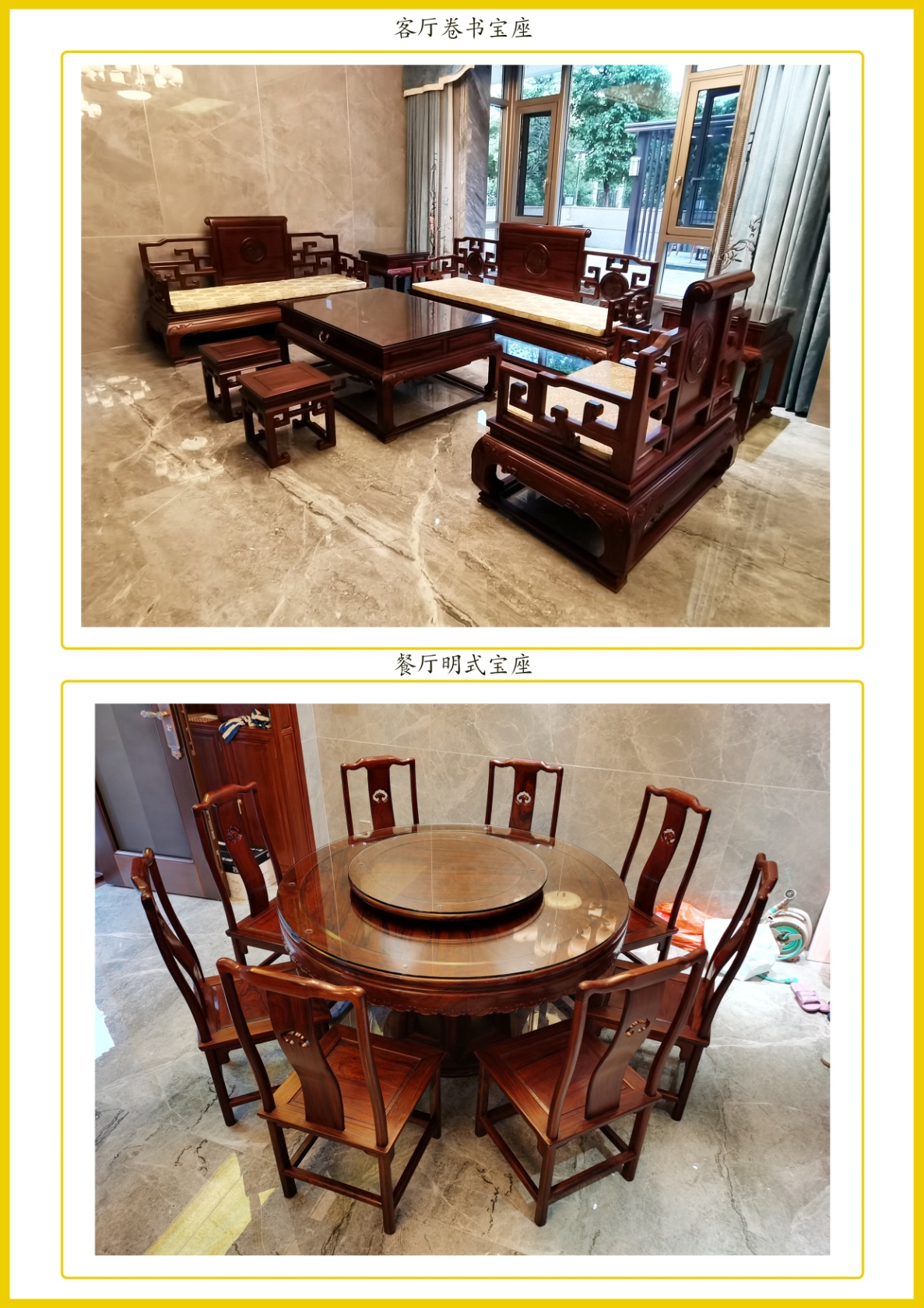 全部家具现场组装完毕,整体效果一目了然,客厅是明式经典卷书沙发大宝座。餐厅是经典南官帽系列的圆餐厅,体现了我们中国人家庭合美团圆的餐桌文化。定制柜类是结合客户的使用功能精心设计,全部以素面为主,没有古典中式的家具的繁琐的,也不失中式家具的韵味,整体简洁大方。